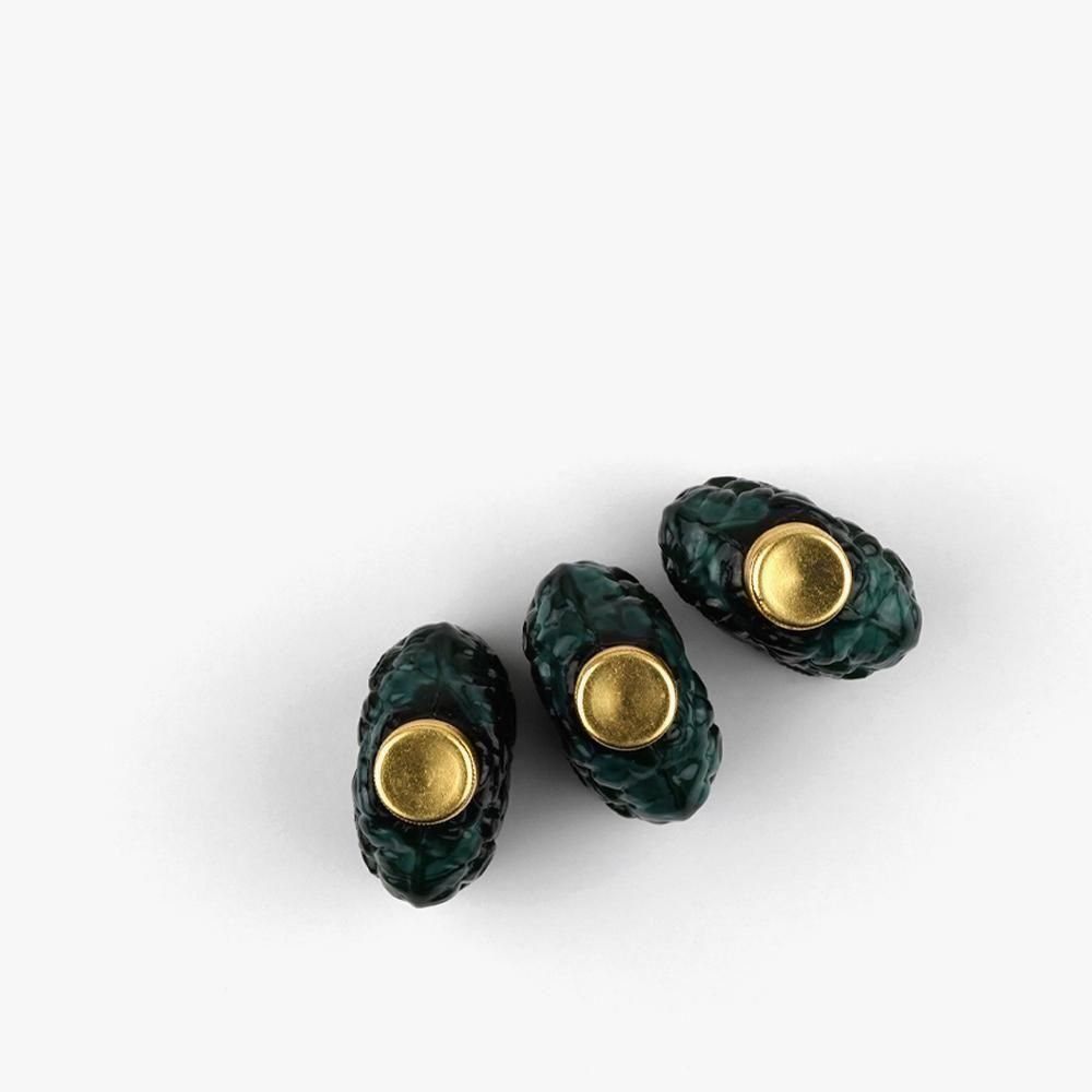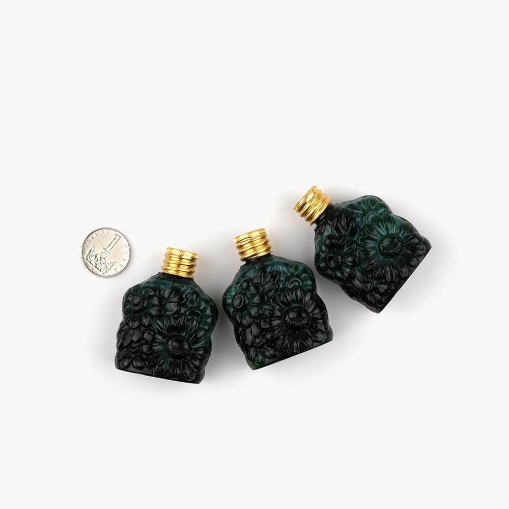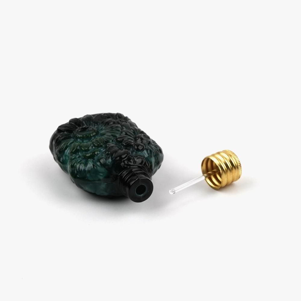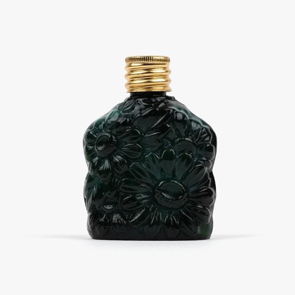 マーガレットのような、かわいらしい花がデザインされているガラス製のアトマイザーです。存在感のある暗い青緑色に目が留まります。手のひらに収まる可愛らしいサイズも魅力的。香水瓶として使用するだけでなく、お気に入りの場所に飾り、インテリアとしてもお楽しみいただけます。